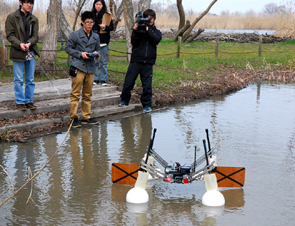琵琶湖の水環境を調査する「アメンボ型ロボット」の研究開発に取り組んでいる中央大学理工学部の中村太郎教授が十六日、近江八幡市の西の湖園地で試作機の試験運転を行った。