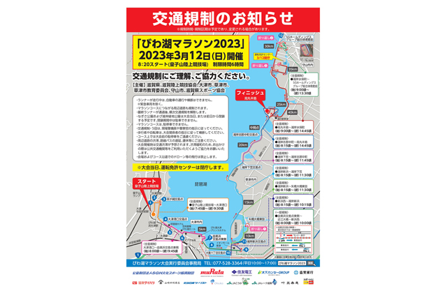 【県】 きょう12日、市民マラソン大会「びわ湖マラソン2023」が大津市、草津市、守山市の湖岸周辺で開催されるのに伴い、コースと周辺道路で大規模な交通規制が随時実施される。県は「コース一帯でのマイカー利用の自粛などに協力を」と呼びかけている。