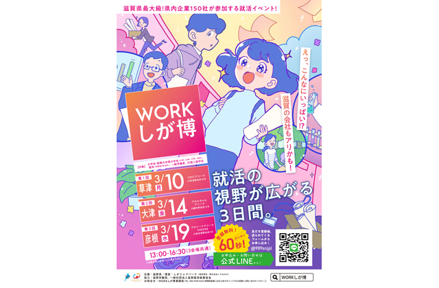【全県】 県は新卒予定者採用活動の広報解禁に合わせ、求職者と県内企業のマッチングを促進する合同企業説明会「WORK(ワーク)しが博」を県内3か所で開催する。