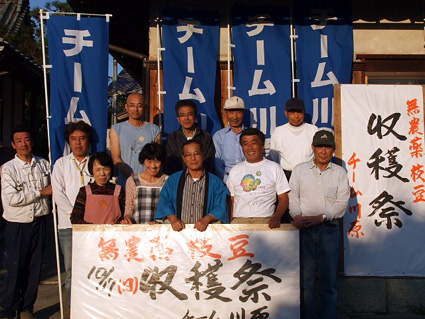 転作地や空き農地など約一ヘクタールを活用し、うす青大豆の無農薬栽培に取り組む。初心者集団ながら二年目の収穫量は初年の約一・八倍で、平和堂蒲生店前に自前の直売所を設け販売したほか、ネット販売(http://team-kawara.net/)も手掛けている。