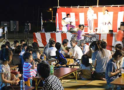 近江八幡市安土町常楽寺の常の浜水辺公園で10日夜、最後の夏祭り「観月の夕べ」が開かれ、大勢の人々で賑わった。