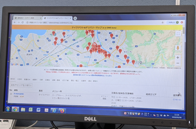 M.Y.Systems(東近江市妙法寺町)の向陽一朗代表は、地元の飲食店が閑散としていた現状から自分ができることを地元のために生かそうと「テイクアウト&デリバリーマップin e-OMI」(https://takeoutmap.code4eomi.org/)を先月12日にいち早く開設した。マップと店名が一目で確認できるページとなっており、現在では東近江市や近隣の日野町や愛荘町の飲食店約90店の掲載がある。