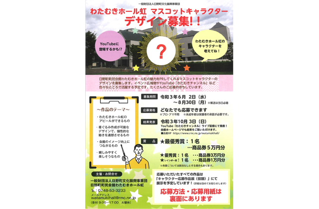 【日野】 日野町町民会館わたむきホール虹は、同館の魅力をPRするマスコットキャラクターのデザインを募集している。マスコットキャラクターはイベント広報物や、YouTube「わたむきチャンネル」など様々なシーンで活用する。