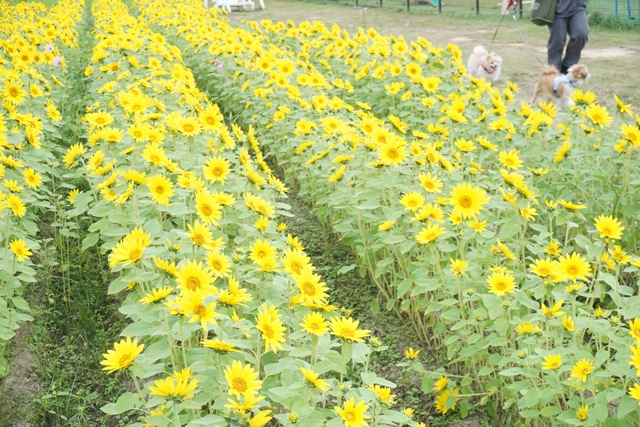 また、ドッグラン横のアニマルガーデンでは秋のヒマワリも満開となっている。夏とはまた一味違う背の低い小ぶりなヒマワリ約5万本を、今月末ごろまで見ることができる。
