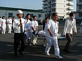 この後、通報を受けた消防車が続々と到着し、隊員らは大きな声をかけてあって手順を確認しながら、屋内進入とはしご車の二手に分かれて、きびきびとした動きで消火と救出にあたった。 救出では、屋上に取り残された患者を救出するため、梯子(はしご)車の梯子を伸ばし、「今そちらに行きますので落ち着いて」と励ましながら、梯子を慎重に近付けて患者を無事に救った。 このほか、救護所での応急手当て、消防車による一斉放水などの訓練が行われ、約三十分ほどで終了した。 村田隆副署長は最後に「病院火災で共通するのは、初期消火の失敗、通報の遅れ、防火設備が適正に機能しなかったなどがあるので気をつけてほしい」と意識の高揚を促した