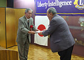 同クラブは昭和三十八年、八日市市と近江八幡市の両ライオンズクラブによって日本で五百七十六番目、滋賀県で八番目のクラブとして旧能登川町・五個荘町をエリアに創立され、友愛と奉仕の精神のもと、青少年の育成支援や河川清掃等の地域活動を展開しており、結成四十周年には、両町に福祉自動車を寄贈したほか、JR能登川駅東口前にソーラー式時計塔を設置し、多くの人々に利用されている。 今回は、四十五周年記念事業として、メンバー全員が一人五百ドルを出し合い、国際協会視力ファーストキャンペーンに百四十四万千円を献金したほか、緊急時に役立ててほしいと、AED(自動体外式細動器)を購入。能登川と五個荘支所にそれぞれ一台を寄贈し、藤居会長から久田副市長へ目録が手渡された。