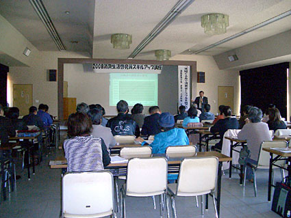 ◇東近江 東近江市は、消費生活啓発員の更なる意識向上と啓発スキルを高めてもらおうと、滋賀弁護士会の土井裕明弁護士を講師に迎え、このほど「地域ぐるみで消費者トラブルを防ごう」と題したスキルアップ講座を開いた。 講座では、五十人以上が参加する中で、土井弁護士が「増え続ける高齢者の消費者被害には、まず手口を知ることが大切。冷静に対応し、早めの対処・相談が必要。そのためには地域での見守り、助け合いが被害防止につながる」と、パワーポイントを使って分かりやすく講演した。 また、会場では、消費トラブルを抱えた近所の人を消費生活センター(市役所東玄関口)に誘導するなど、トラブルを未然に防いだ事例も報告された。 このほか、啓発員(六十六人)が地元の高齢者ふれあいサロンに出向き、大型の紙芝居を使った出前講座や、認知症サポーター対象のスキルアップ編を実施している。 続いて市役所別館で開いた「認知症サポーター研修」では、消費生活出前講座の実践事例を発表した。同じ地域を支える認知症サポーターにも、啓発員が取り組む活動の様子を学んでもらおうと実施したもの。=写真= 安心して暮らせる東近江市を互いに目指そうと、養成講座で学んだことを家庭・地域・職場で正しく伝え、それぞれが「自らできる啓発活動は何か」などと問い掛けた。 その上で、点検商法を一例に挙げ、悪徳業者の手口の紹介や対処方法などを手作りの大型紙芝居を使ったり、分かりやすい寸劇風にして、認知症サポーターに紹介した。