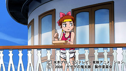 近畿エリアには滋賀県も紹介され、ネコ娘がふなずしをかじりながら観光船ミシガンに乗り、船の帆先で琵琶湖をきょろきょろと見渡すシーンが描かれている。 物語は、鏡爺(かがみじじい)によって妖怪ポストに手紙を出した風祭華が鏡の中にひきずり込まれ、さらにネコ娘たちは全国各地へ吹き飛ばされ、鬼太郎も鏡の世界へ閉じ込められる。なんとか鏡爺を破り、鏡の世界から脱出する鬼太郎だが、遥か太古に閻魔(えんま)大王が封印したはずのヤトノカミが、よみがえりはじめる。その復活の鍵を握るのが華だと知った鬼太郎は、彼女を守るため、日本を救うために立ち上がる。