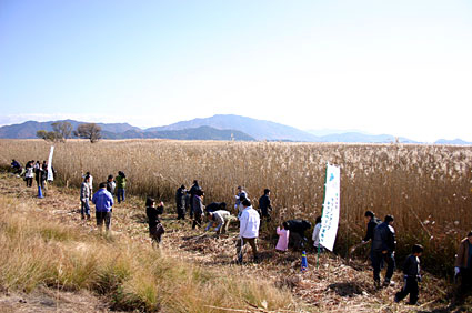 ◇東近江・安土町 「お~いお茶」の売上の一部を琵琶湖の環境保全活動に寄付する株式会社伊藤園(本社 東京都渋谷区)の「お茶で琵琶湖を美しく。」キャンペーンの一環として、琵琶湖葦(よし)刈り体験が、このほど安土町大中地先の西の湖にある県有地で行われた。 大阪や京都在住の同社社員と、同社のホームページを見て参加した県内外の一般消費者ら百人あまりが参加。長靴と軍手、手には鎌を持った参加者が、約二時間、葦刈りに汗を流した。 作業場所には、嘉田由紀子県知事、津村孝司安土町長らが激励に訪れ、参加者と一緒に葦刈りに参加。嘉田知事は「京都、大阪の皆さん、蛇口の向こうに琵琶湖があります。“葦にもよし、人にもよし、琵琶湖にもよし”の三方よしの活動に、感謝します。西の湖はこのたび、ラムサール条約にも登録されました。この活動から、次の世代に関心をもっていただければ、ありがたい」と、参加者に礼を述べた。