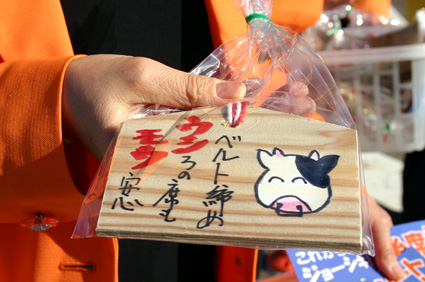 絵馬の片面には一つひとつ手描きのかわいい牛の絵に「ベルト締め ウシろの席も モウ安心」の牛に引っ掛けた交通安全の標語が添えられ、もう片面には「交通安全」の願いの文字が書かれている。