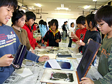 午後からは同小多目的室で、ガリ版伝承館職員の田中浩さんと深見勝さんの指導を受けながら、年賀状やクリスマスカードなどはがきサイズの作品づくりに挑戦。