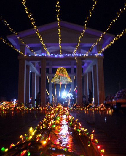 飾り付け等もすべてボランティアによるもので、主催のライティングベル実行委員会と能登川地区まちづくり協議会を中心に地域住民が集い、今年は、公民館活動の「このゆびとまれ」の子どもたちと竜王町青年団も参加。希望のベルやサンタクロース、かわいらしいケーキなど約十万個のライトが公園一帯を美しく灯している。