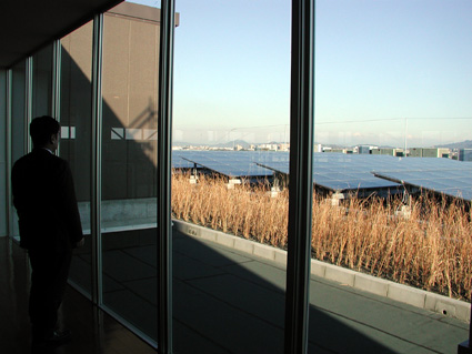 六階セントラルコートからは、エコの取り組みで象徴的な自然エネルギー、太陽光発電のパネルが一望できる。