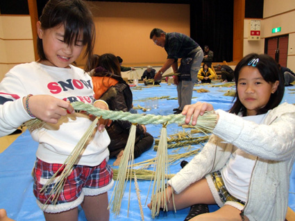 自分で作ったしめ縄を手に、山口舞羽ちゃん(8)は「百点の出来」と大満足の様子で、姉の珠奈ちゃん(11)も「機械で作るものだと思っていたけど、手作りしたしめ縄はとてもきれいで驚いた。編み込む三本の縄を同じ太さにすると見た目がよりきれいになる」と手作りの良さを実感していた。