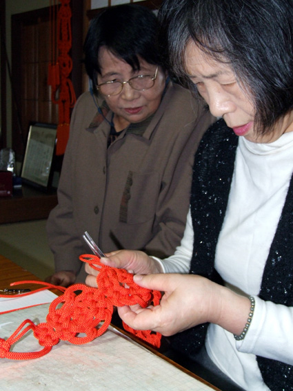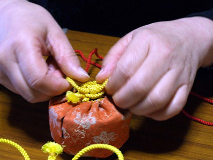一本のひもから生まれる造形美に田中さんが出会ったのは、昭和三十九年に入門した茶道石州(せきしゅう)流清水派・橋田正園さんの稽古場。橋田さんは、他者による毒物混入を防ぐため、仕服(しふく=茶入れ袋)のひもに凝らしたとされる花結びの一種“封印結び”の復元に取り組んでいた。