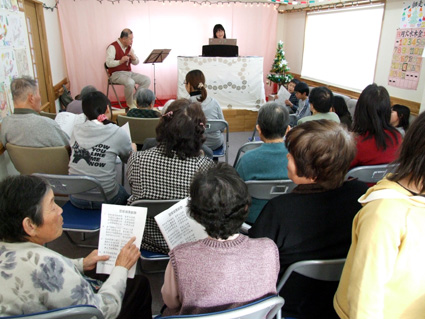 会では、クリスマスにちなんだ名曲や懐メロ、アニメソングなどがピアノとフルートの音色に乗って流れ、リズムを取っていた参加者らは「懐かしい曲やな~」「青春を思い出すわ」などと話し、いつしか大合唱になっていた。