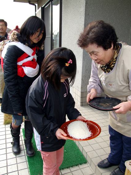 身近な地域の人たちと触れ合い温もりを感じた後は、常信寺本堂で年行司が炊いたしょうゆ飯を全員で食べ、冬休みの思い出として楽しいひとときを心に刻んだ。