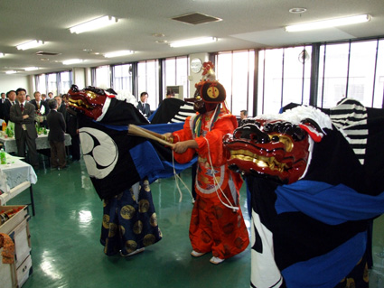 また、暗い話題を一掃する華やかで力強い獅子舞を、国重要無形民俗文化財に指定されている伊勢大神楽講社の山本勘太夫組が披露し、物事が円滑にすらすらと回っていく様子を表す傘の曲で升(ます)を回して見せ、商売のますますの繁栄・発展を祈った。
