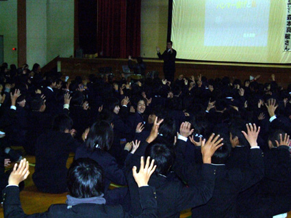 生徒たちは拍手を表す手話を習い、森本さんにお礼の気持ちを表現。講演後、三年生の西村亜弓さんと安田実加さん、菱田美嘉さんは「やさしそうな人だなと思った。途中で夢が途絶えたのに、ハンマー投げで優勝できるまで努力し、がんばっているのはすごい」、また西津里香さんは「試合に観客がいなくて、悲しいなと思った」と話していた。