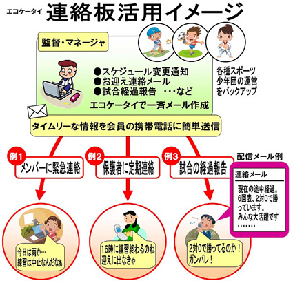 なお、同社は社会貢献の一環として、スポーツ少年団百団体へ会員保護者への一斉連絡などでも便利なecoケータイのソフトを利用料無料で提供する。問い合わせは同社(TEL0749―52―5239)へ。