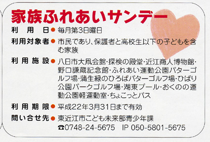 東近江市は、毎月第三日曜日を「家族ふれあいサンデー」と定め、核家族や少子化の進行などで家族の結びつきが希薄になっていることから、家族の大切さを呼びかけ、改めて家族や家庭について考える日として推進している。