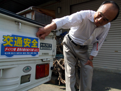完成したステッカーは、縦十五センチ、横三十センチの大きさで、「交通安全」という文字の下に「ダイハツ車愛用の輪を拡げる郷山之上」と明記されている。