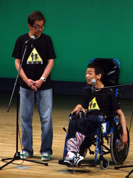 会場を笑いの渦に巻き込んだのが、脳性まひにより車いす生活を送る森山慶一さんと養護学校教諭・小倉義昭さんの漫才コンビ“ホイルチェアー”。森山さんが大学生になってから初の舞台とあって、ネタに一人暮らしや将来の夢を織りまぜ、絶妙な掛け合いで大爆笑を誘った。