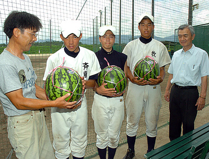 また、午後には、愛東地区の農事組合法人・アクティブファーム百済寺の代表・山本友彦さん(55)が、留守番の野球部員が練習する第二グラウンドを訪れ、今年一番の大きさの角井西瓜(すいか)三個をプレゼントした。