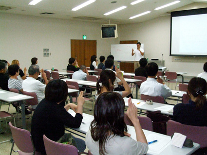 「聴覚障がい・者の理解」と題して、先天性高音難聴である森本さんが、聴こえる仕組みと聴覚障害の種類、聴力レベルの違いを詳しく解説。受講者約四十人は、聞き取りクイズを通して感音性難聴と伝音性難聴の人たちがどのように音をとらえているのか体感し、聴こえない世界を知った。