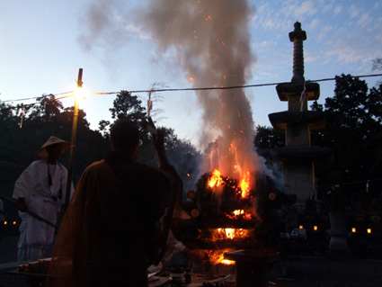 空があかね色に染まった午後六時半、日本最大最古の三重石塔「阿育王塔」前で護摩木供養が始まり、高く舞い上がる炎の中へ家内安全や商売繁盛などと記された願い札が次々と投げ入れられた。
