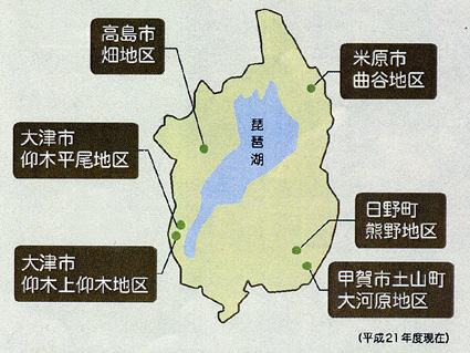 棚田ボランティアは、畑地区(高島市)、平尾地区(大津市仰木)、上仰木地区(大津市仰木)、曲谷地区(米原市)、熊野地区(日野町)、大河原地区(甲賀市)、の六地域(図参照)で実施されている。