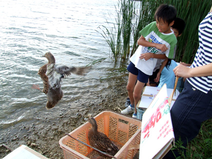 竜王町立竜王小学校の五年生が八日、田んぼの雑草除去や害虫駆除などで活躍したアイガモ九匹を、同町山之上にあるアグリパーク竜王の三田池に放した。