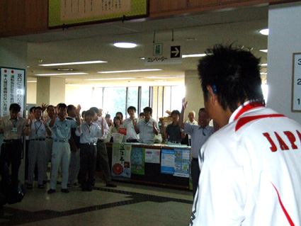 同役場一階ロビーで開かれた報告会で、竹山秀雄町長は「森本さんの活躍は町民にとって誇りであり、金メダル獲得の偉業から喜び・感動・勇気、そして大きな元気をいただいた。最後の一投にかける集中力や決断力からも多くを学ばせてもらった」と語り、町職員約五十人とともに「金メダルおめでとう」と手話で表現した。