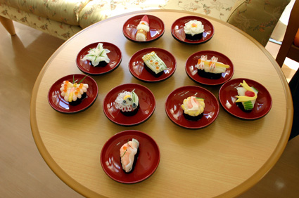 また、「四季の細工ずし」という著書も出している大津市「丸萬」の青山修治さん(62)が、イカやイクラなどのすしネタで「サクラ」や「チョウ」、楽譜を切り取ったような「メロディー」や「サンタクロース」など十種類の細工ずしを次々とつくると、仲間たちは口々に「きれい」「かわいい」「すごい」などと感動の声をあげ、芸術作品に心奪われていた。
