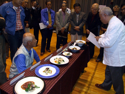 また、会場では、大津プリンスホテルで実際に提供されている日野町産の日野菜を使った和・洋・中の料理(牛フィレ肉の網焼きシナモン風味のポルト酒ソース日野菜添え・ホタテ貝のポワレとトリュフ風味のサラダ仕立てミニ日野菜とともに・日野菜とベーコンの特製スープ麺・日野菜の天ぷらなど七品)が紹介され、北野氏が「スープ麺の人気が高く、日野菜の活躍をぜひ見に来て、味わってほしい」と呼び掛けた。