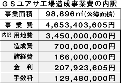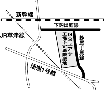 建設中止となった栗東市の新幹線新駅予定地と周辺地域の企業誘致で、電池メーカーのジーエス・ユアサコーポレーション(本社・京都市、GSユアサ)の工場予定地と隣接地約十ヘクタール(同市蜂屋、地権者五十六人)の買収・造成事業費の内訳が分かった。