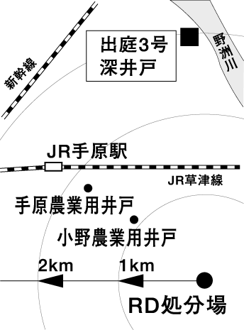 さらに、出庭深井戸三号とRD処分場の中間地点にある手原農業用井戸、処分場一・一キロ下流の小野農業用井戸からは、環境基準三倍超のヒ素やダイオキシンが近年になって検出されるようになり、RD処分場との関連が懸念される。