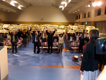 ワールドカップ転戦中のわずかな時間をやりくりして帰郷したみき選手。中学校時代の同級生である瀧本真奈さんと村田直美さん、安田有仁子さん司会進行のもと、壮行会では、曳山囃子方交流会による生演奏に合わせて入場し、小中学校時代の同級生や地域住民ら約二百人が待つ場内を目にした途端、みきスマイルが弾けた。