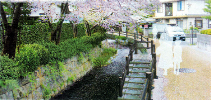 水辺のイメージは、コンクリート三面張りで無機質な空間を、自然石間にホタルが土まゆをつくりやすい石積み護岸に改修し、川辺には植栽し自然の姿に近づける。さらに沿道に水辺に降りられる階段や休息場所を整備し、水辺に親しみやすい空間を演出する。