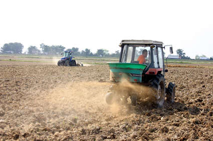 園田さんの近江たんぽぽ村では、事業所七―八社から生ごみをたい肥・農業資材として買い取り、一月ごろから米ぬかや大豆くずなどと混ぜて二次加工した上で、トラクターで生成物をまき、土と混ぜて土づくりを行う。