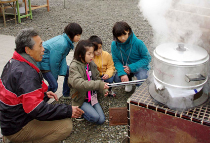 このあとの昼食では、火吹き棒を手におくどさんでもち米を蒸し、出来立ての杵突き餅をみんなでほおばった。