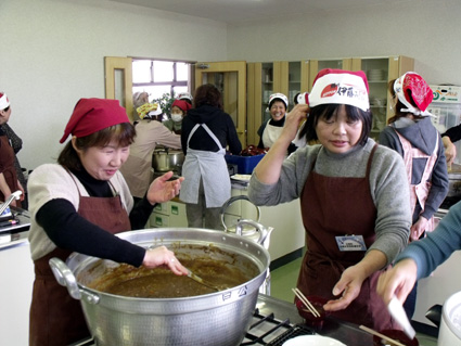 会場では、日野町商工会青年部と日野町地域女性団体連合会がそれぞれ会員の力を結集し、町内商店・団体から寄付された食材を使って、カレーライス・ぜんざい・豚汁・フランクフルト・甘酒・コーヒーを無料で振る舞い、帰り際にはあられのお土産も配った。