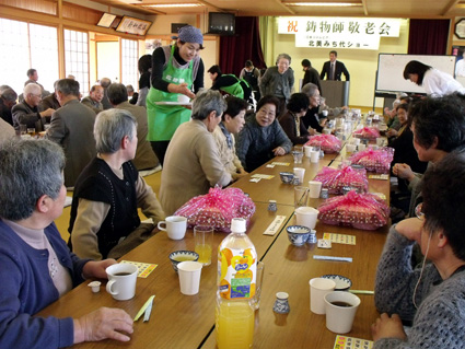 鋳物師町の自治会が主催する敬老会には、町内七十歳以上の男女約九十人が参加し、第一部の歌謡ショーと第二部のビンゴ大会の合間に応援塾のコーヒーを楽しんだ。
