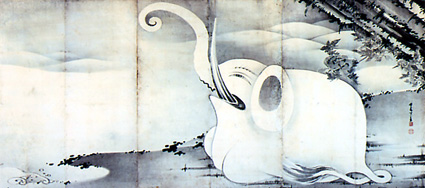 また、江戸時代の寛政七年(一七九五年)に、伊藤若冲が描いた「象と鯨図屏風」は、一昨年夏、北陸地方の旧家で発見された若冲晩年の大作。勢いよく潮を吹く鯨と、うずくまって鼻を高々とあげた象を対置させた水墨画である。海の王者と陸の王者がエールを交換しているような情景は、奇抜さを特色とする若冲の絵の中でも類をみない。