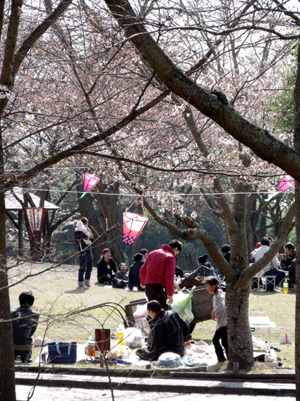 三~四分咲きの先週土曜日には、サクラの木の下の花見サイトで、花よりも団子とばかりに宴を楽しむグループや家族連れで賑わい、子どもたちも元気よく走り回り、春風を体いっぱいに感じていた。