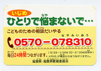 ◇いじめの相談だいやる=TEL0570―078310、開設時間は二十四時間対応(同)。カードの作成枚数は三十万部。