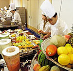 約四十種類の料理が並ぶ夏限定のサマーバイキングでは、琵琶湖産鮎の塩焼き、特製地元野菜カレー、マキノ町産茄子のグラタン、地元産野菜のサラダバー、高島産環境こだわり米の手巻き寿司などを提供。~八月二十二日。営業時間午後六時~午後八時(入場午後七時三十分まで)。TEL0740―28―1111。