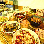 農産物直売所内にある、地元農産物だけを使った約五十種類の料理が並ぶ「地域食材バイキング」。いずれの料理も健康に配慮されたレシピで、地域の食文化を肌で感じられるおふくろの味。営業時間午前十一時~午後三時(入場午後一時四十分まで)。TEL077―585―8318。