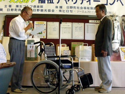 平澤範雄社長は「いろいろな方々のご支援により開催することができた。毎年そして一年でも長くチャリティーコンペを続けていきたい」とあいさつし、日野町社会福祉協議会の藤澤政男会長にチャリティー基金十八万円を手渡した。