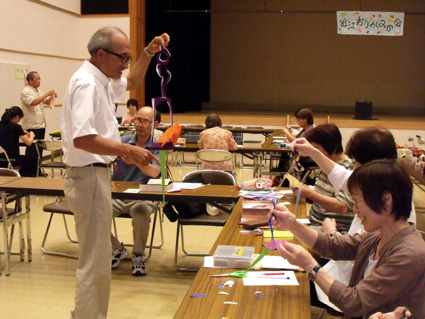当日は、同協会師範級の講師十二人が駆けつけ、連鶴やパラソル・コマ、仲良しインコ、トロピカル・フィッシュ、カエル、玉手箱、吹きゴマ、コスモス、ローズなど十二種類の折り方を伝授。完成した飛行機を手に、老若男女が一緒に飛ばして飛距離を競い合う姿も見られた。